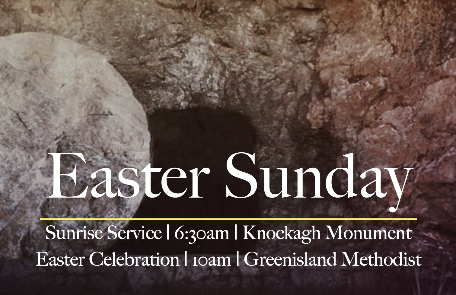 At 6:30am we’ll be joining with all the other churches in Greenisland at Knockagh Monument to sing praises and watch the dawn of Easter Day. (Hopefully the forecast is correct and Storm Dave will have blown himself out by sunrise!) Then we’ll all head down the hill to Greenisland Presbyterian for breakfast