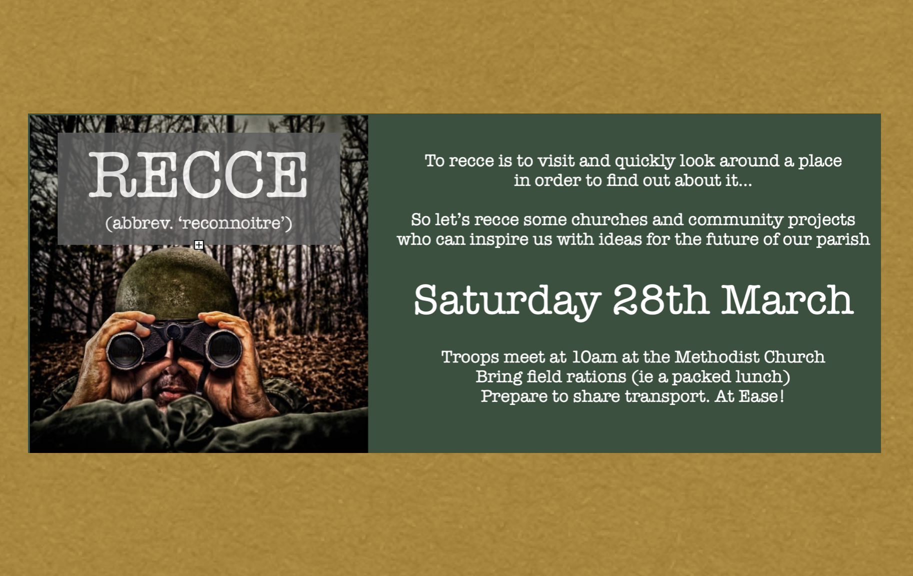 We’re not an army – and we’re not fighting a war – but we do have some big challenges ahead. So, over the next few months, we’re going to organise a few ‘recce’ days out – a chance to visit other churches, community groups and projects. We’ll see what ideas are cooking out there – what works and what doesn’t – and see what might give us inspiration for our future rebuilding plans here in Greenisland.